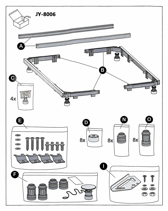 Disporre tutte le parti del telaio del modello 8006. Collegare le barre laterali e i giunti angolari utilizzando le viti fornite nella confezione. Assicurarsi che il telaio sia quadrato e sicuro.
